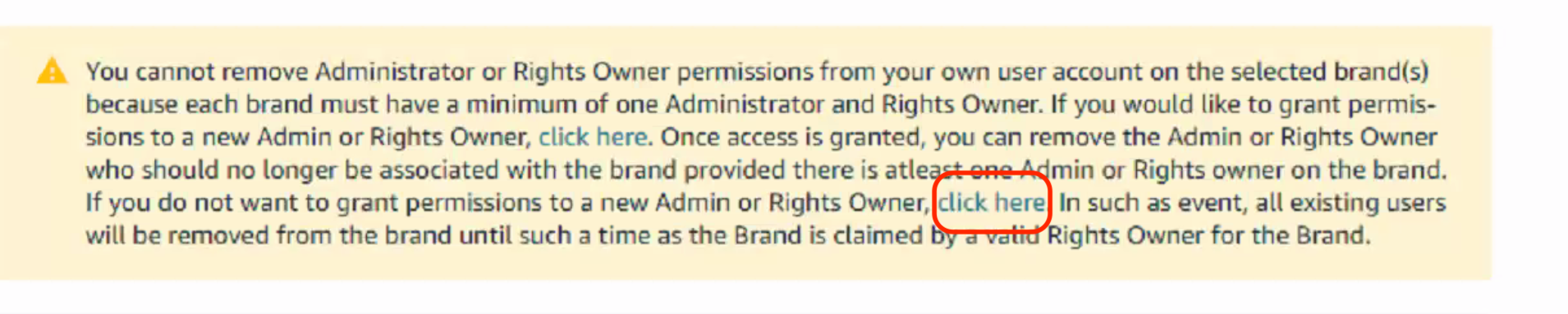 We have partially removed the brand (Enter brand name) from the brand registry by removing all users including our permission. Hence, there are no expected brand users of “Brand Name” at the moment.