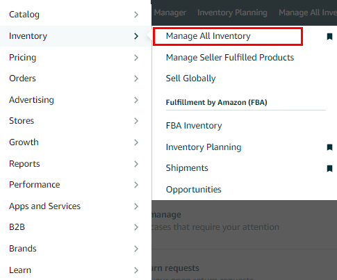 1. In Seller Central, go to the Inventory then, click "Manage All Inventory" to view the listing you want to modify.