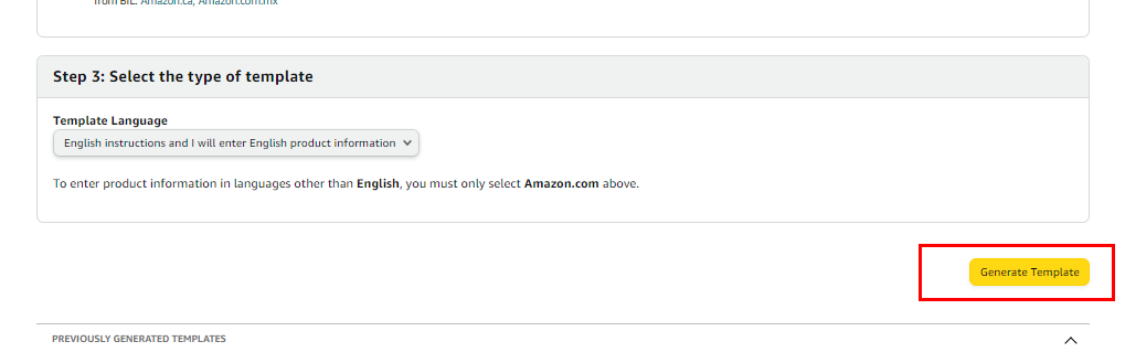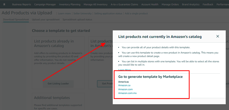 4. A pop-up page will appear where you need to specify the appropriate marketplace template. Ensure that you obtain the template corresponding to the marketplace you wish to update your listing on.