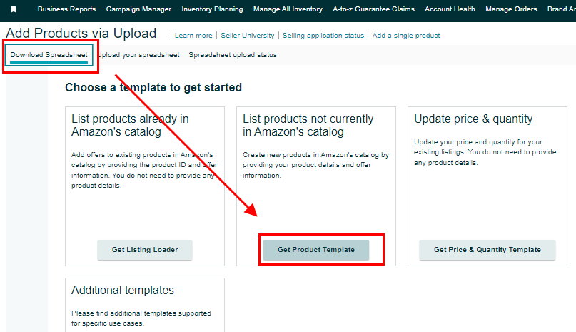 3. When you are on the 'Add a Products via Upload' page, navigate to the 'Download Spreadsheet' option and select 'Get Product Template.'
