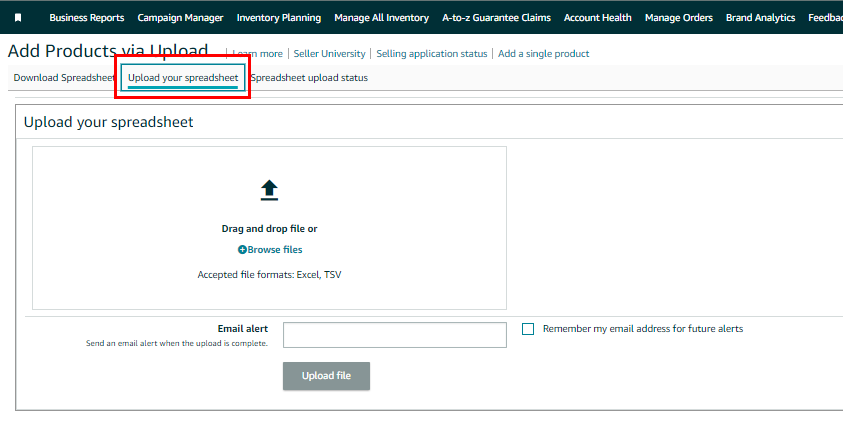 4. Once your file is complete, save it and upload it to Amazon, by clicking on ‘Upload your spreadsheet.' You will then see the following screen: