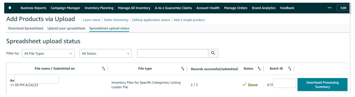 5. Wait until the inventory file is processed +15 mins and make sure it is uploaded successfully and keep the BATCH ID