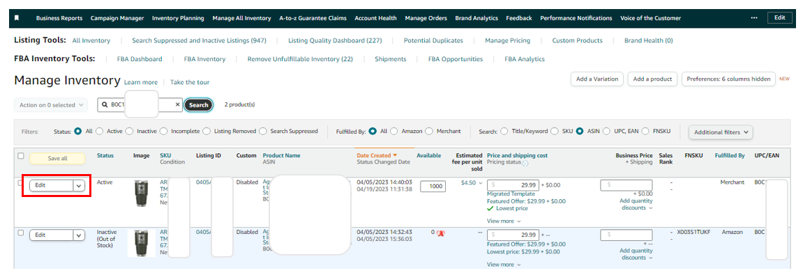 2. The image below is a sample where you can see all of the listings on Amazon, both active and inactive. Just look for the item that you need to edit and click the "Edit" button on the left.