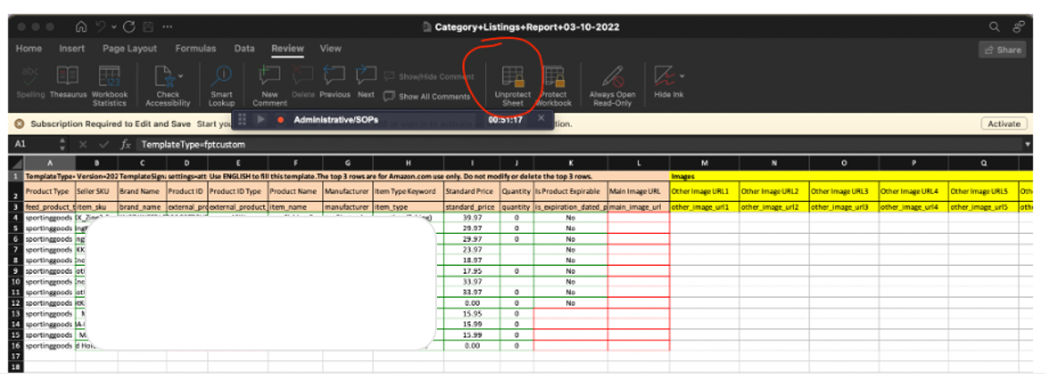 2. Once Category Listing Report is downloaded, open the downloaded file then go to the “Review” section and click “Unprotect sheet”. Turn on the filter and locate the listing that you are going to update (SKU) by searching it through the Seller SKU column.