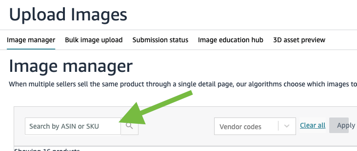 Search the ASIN you need to upload the images to.
