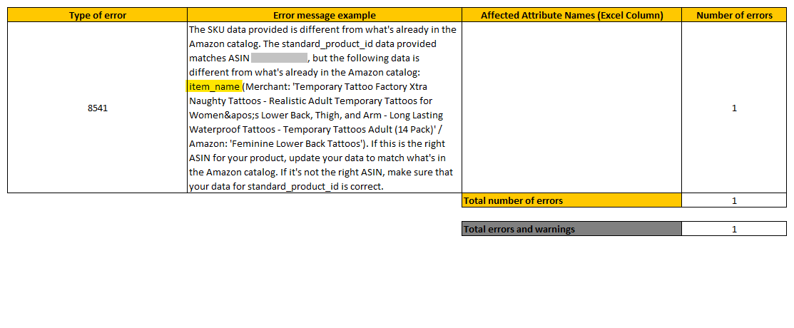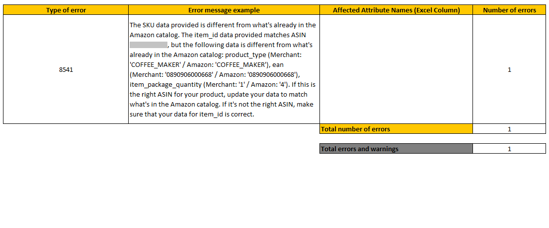 Error Code: 8541 - This occurs when Amazon rejects the updated value of an attribute because it differs from the current value stored in their catalog. It is commonly associated with issues related to listing updates and product attributes such as Size or Style.