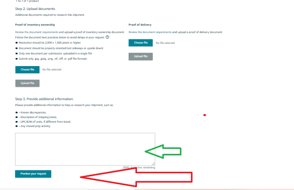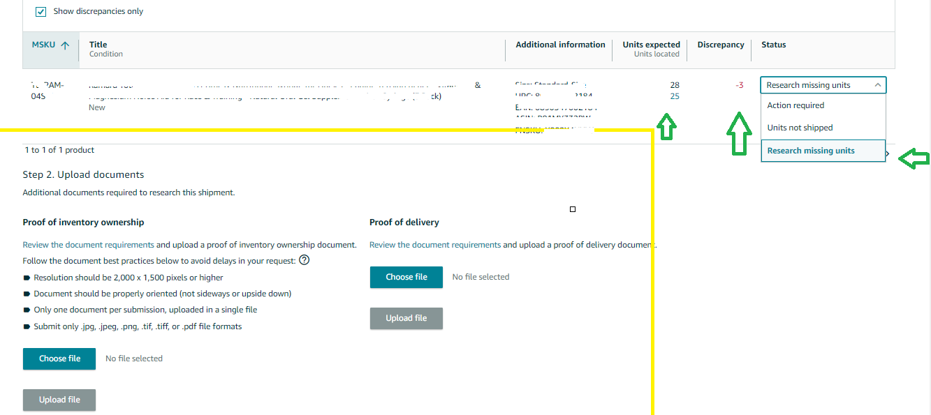 4. After selecting an option for each eligible discrepancy, upload a document that verifies you own the inventory associated with each discrepancy you requested for research.