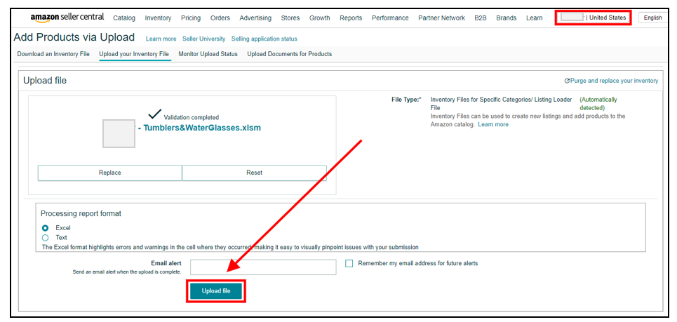 6. Save the flat file and upload it on Seller Central. Go to Inventory > Add Products via Upload > Upload your Inventory File. Refresh the page first before attaching the file and make sure you’re on the right Amazon store. Then click Upload file.