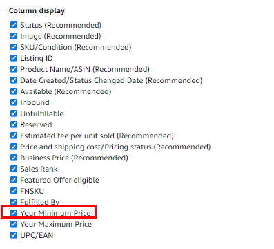 4. On this page, you will see the set of column displays. Go down and tick the box under ‘Your Minimum Price’