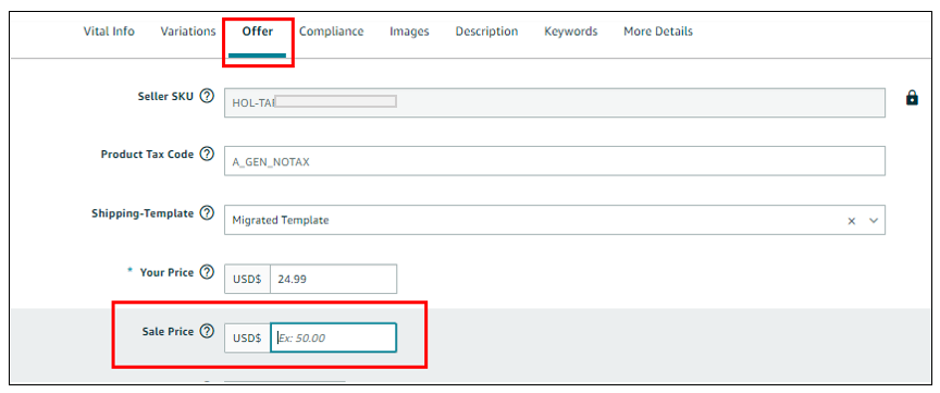 a. To verify the Sales Price, go to the Offer page/tab of your listing by clicking on the Edit button of the affected ASIN.