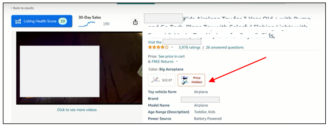 Here’s a sample screenshot of what a listing would look like on the Amazon detail page when the price is hidden. Although the item is still available for purchase, buyers may find it challenging to confirm the price as they must proceed to the "add to cart" function to view it.
