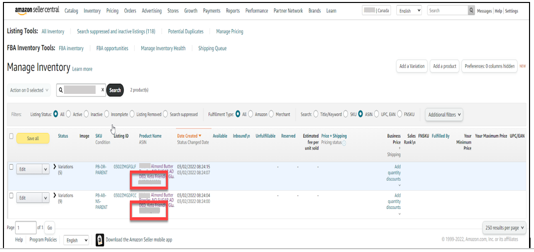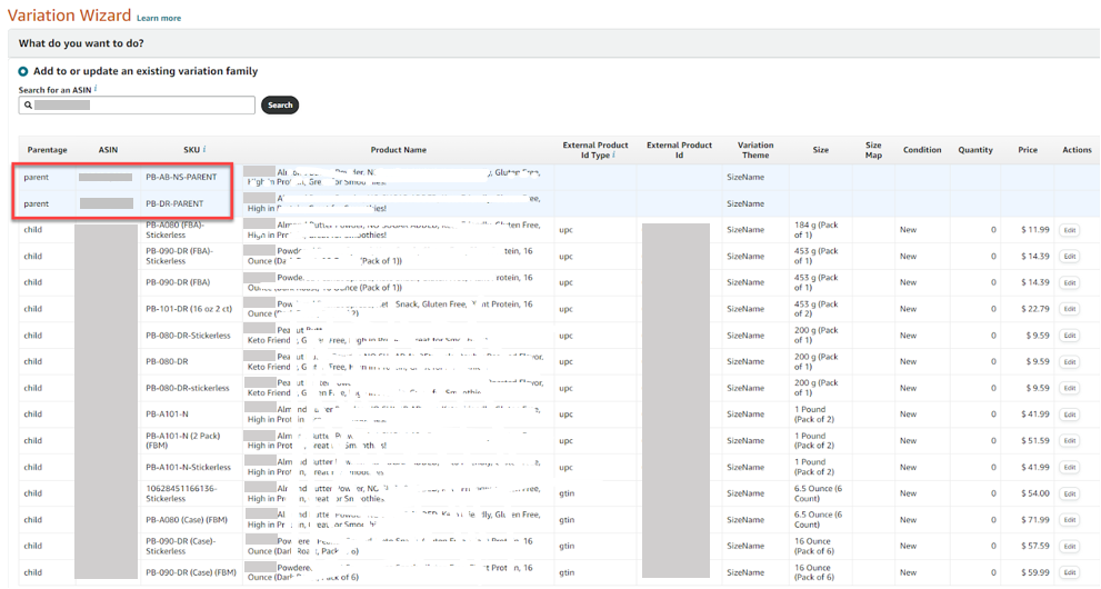- Keep the 2 merged Parent SKUs together so that all child listings will appear in the Variation Wizard. Seller Support will not see what our Inventory Page looks like, so they need to see what we’re talking about using the Variation Wizard.