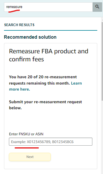 1.) You can request a remeasurement through the Remeasure FBA products and confirm fees widget. Locate the widget by typing “remeasure” into the search bar.