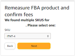 2.) Enter the FNSKU or ASIN in the “Enter FNSKU or ASIN” box and then select the “FBA” SKU. Click Next.