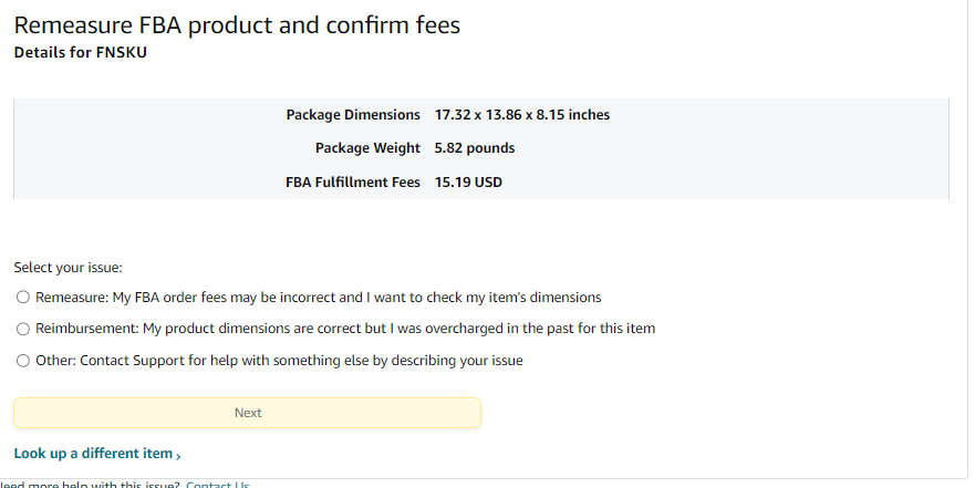 3.) Check the package weight and dimensions and FBA fulfillment fees before requesting re-measurement or reimbursement then “Select your issue” and click Next.