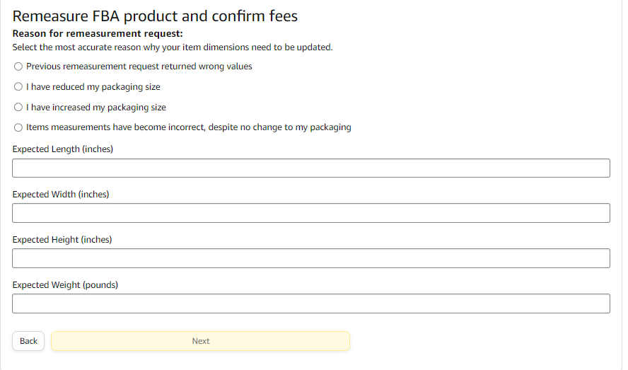 5.) Once the request is submitted, Amazon will provide the current weight and dimension as well as the FBA fees. Amazon mostly responds to re-measurement requests within five business days however, some cases may take longer.