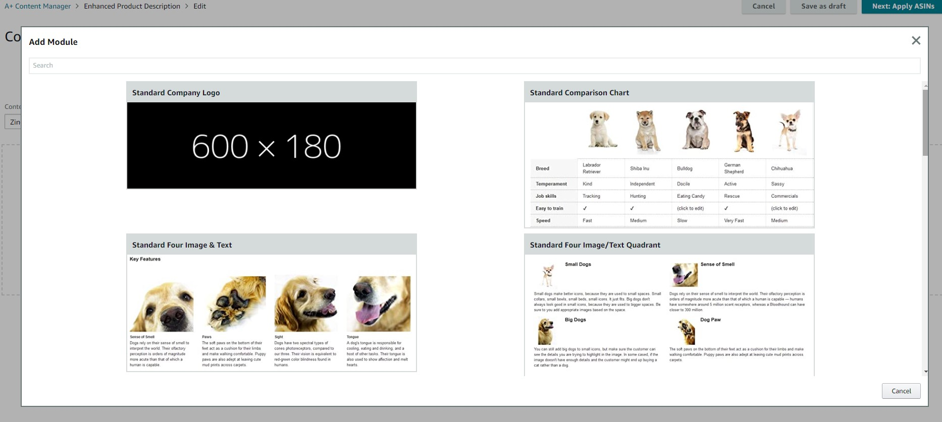 Center Page - “Add Module” will allow you to start selecting your A+ Design Layout.