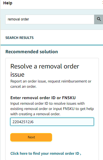 1. Locate the widget by typing “removal order” into the search bar. 2. Enter removal order ID or FNSKU ➜ NEXT