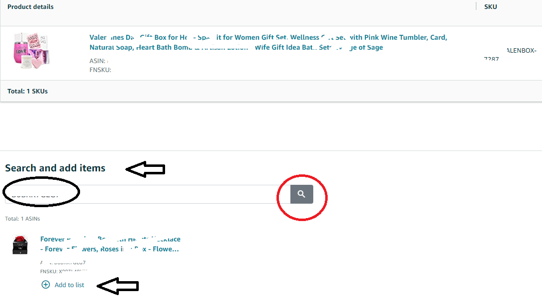 6. If you want to add inventory to the list, enter a Title, SKU, or ASIN in the “Search and add items” text box at the bottom of the page and then click Search. Select the products you want to remove and click Add to the list.