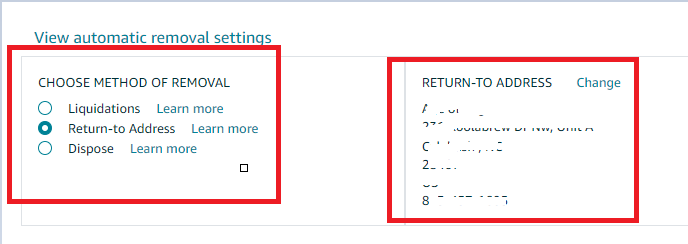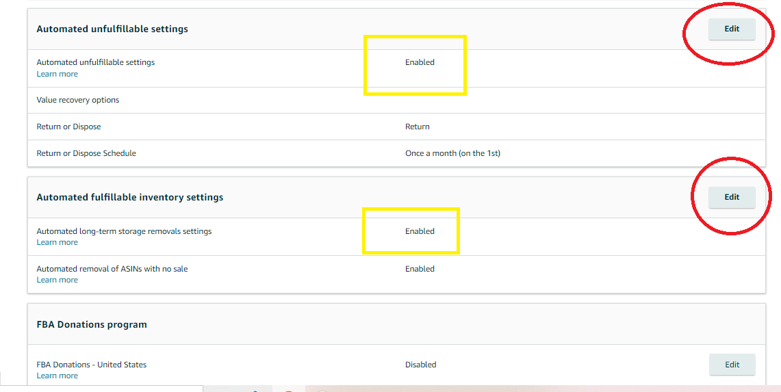 To enable automatic removal of inventory: 1. Go to Setting ➜ Fulfillment By Amazon 2. Click Edit ➜ Enable 3. Select whether you want to return or dispose of the units 4. Set your schedule 5. Input all the other required information 6. Finally, click Update.