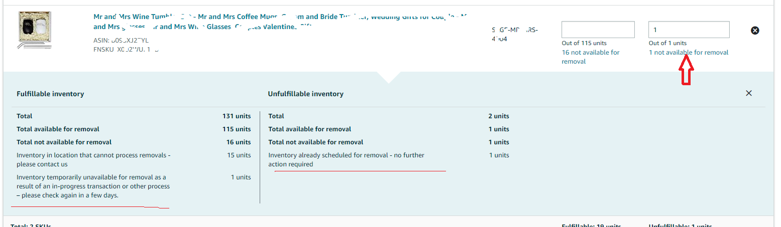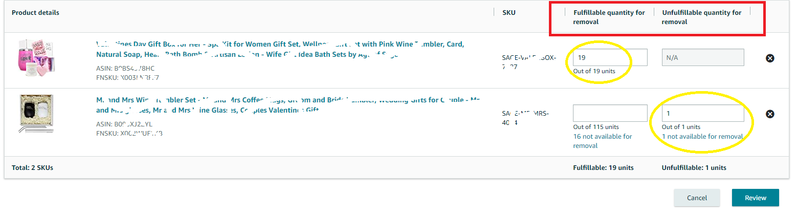 7. In Fulfillable/Unfulfillable quantity for removal, enter the number of fulfillable/unfulfillable units to remove. Review the total inventory available for removal, and the total inventory not available for removal.