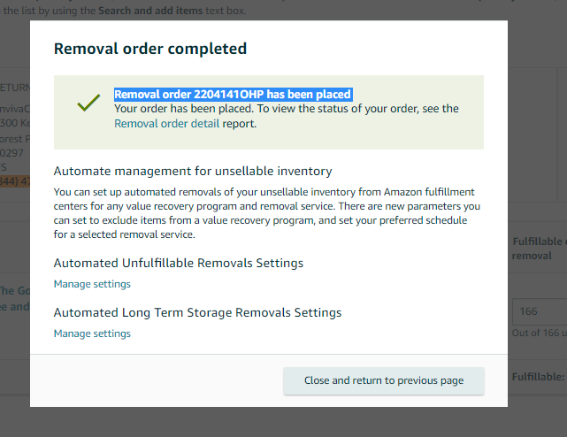 10. A removal order creation is successful once you receive a pop-up message that reads, “Removal order has been placed. Your order has been placed. To view the status of your order, see the Removal order detail report.