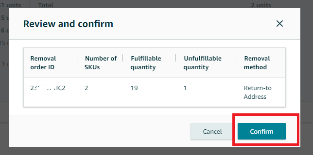 8. Click Review (Review the order ID, method of removal, ship-to address, and the details of the selected items for removal.)