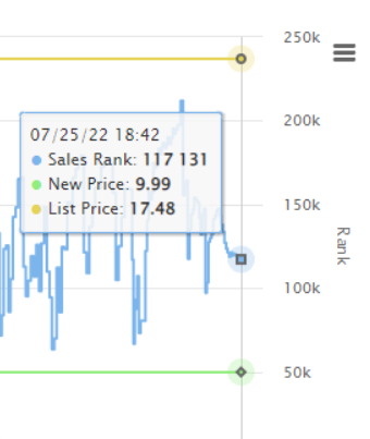Please refer to the image below for reference. The List Price History (yellow) will show up alongside the sales rank (blue) and price history (green) on the detail page beneath your Bullet Points section when you install the Helium10 Chrome Extension. The lack of any yellow coloring on the graph indicates that a list price has not yet been established.