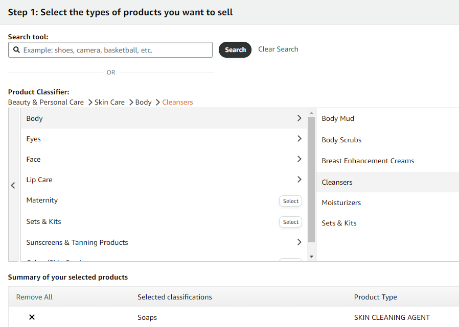 3.1 Follow the Category path of your product or listing. Example: Beauty & Personal Care > Skin Care > Body > Cleansers