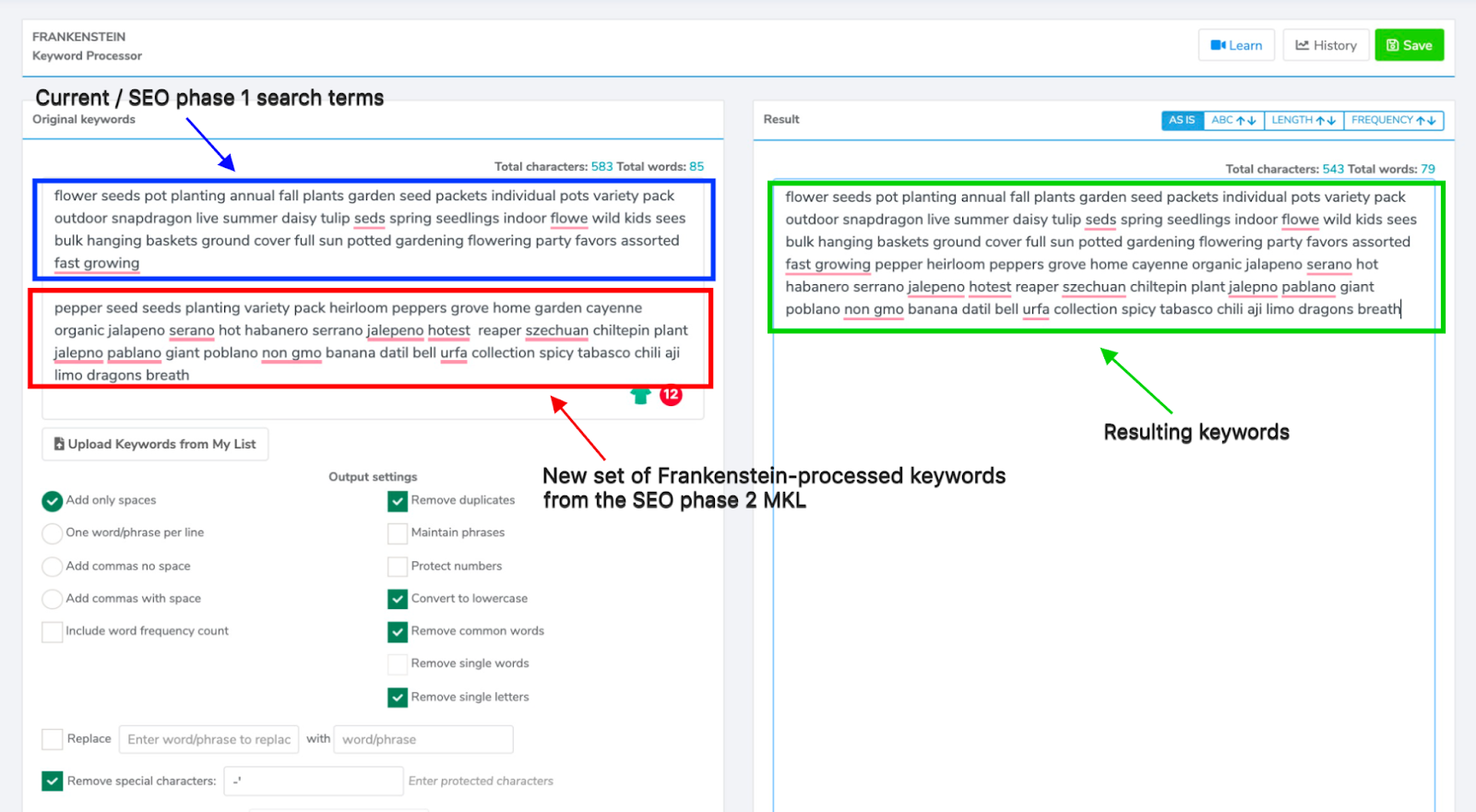 1. the current (phase 1) search terms and paste them into the Original Keywords field of the H10 Frankenstein tool. Do the same for the new set of Frankenstein-processed keywords (step 3 resulting keywords). This process will eliminate the duplicate keywords in the current and the new search terms.