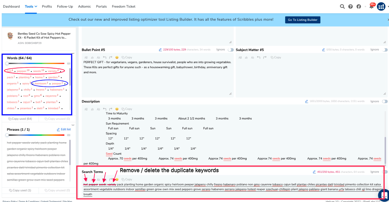 Objective: Your objective is to detect, eliminate, and replace repeat keywords (pink terms) from the search terms using H10’s Scribbles Listing Optimizer.