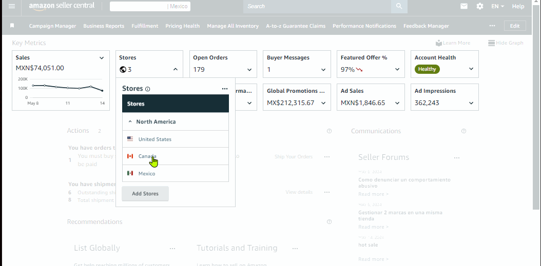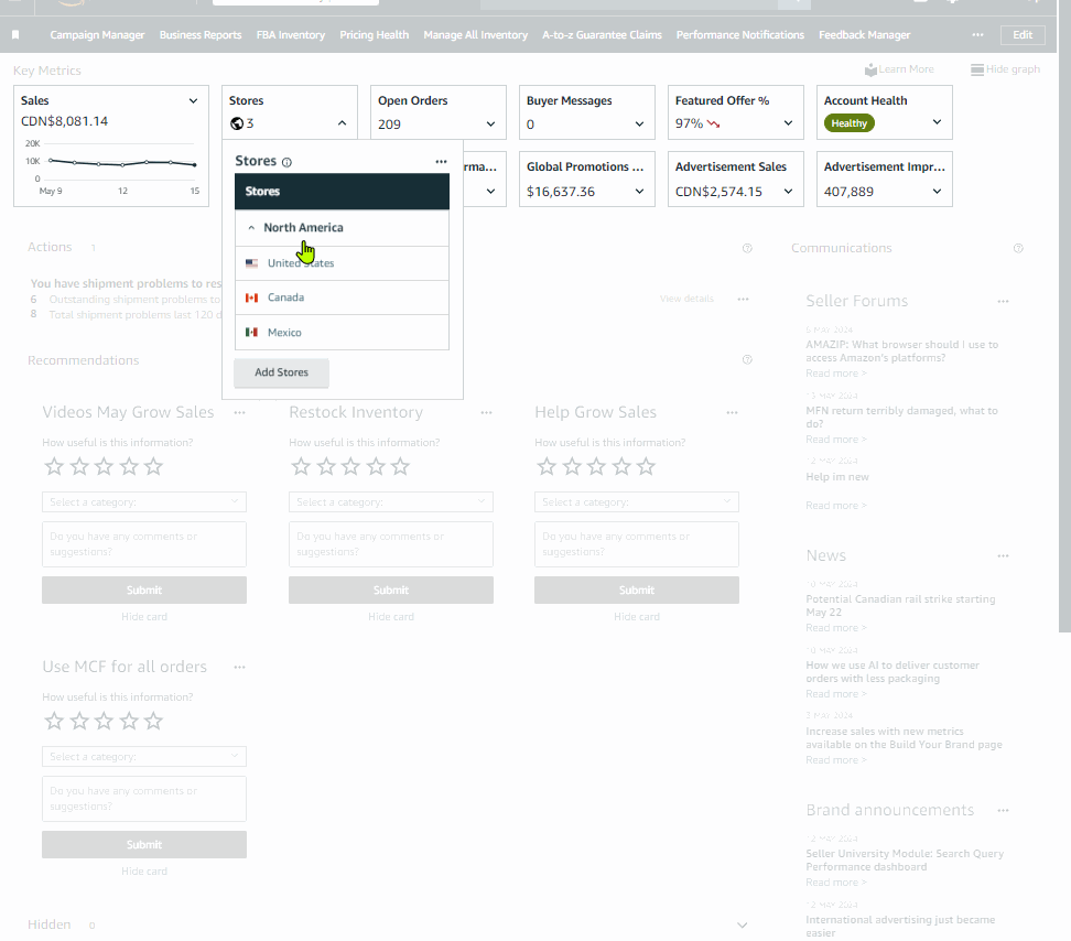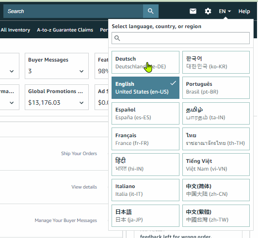 Alternatively shortcut link to any other available marketplaces dashboard by clicking the value either of each respective “Order product sales” or “Units” without the need to use Account and Marketplace Selection.