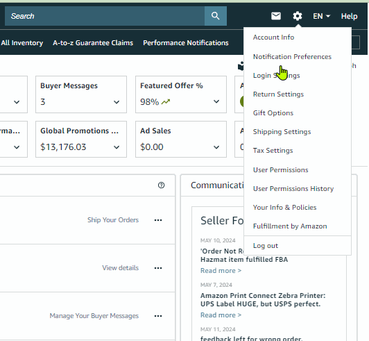 Holds the links to Account info, primary settings such account permissions, bank and tax settings and FBA settings.