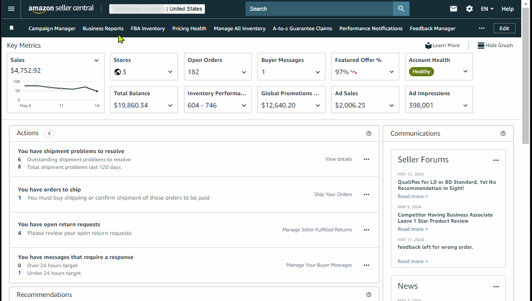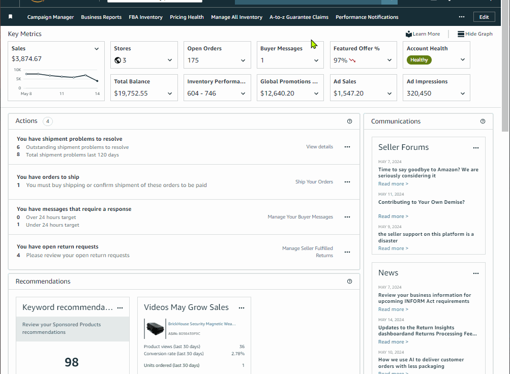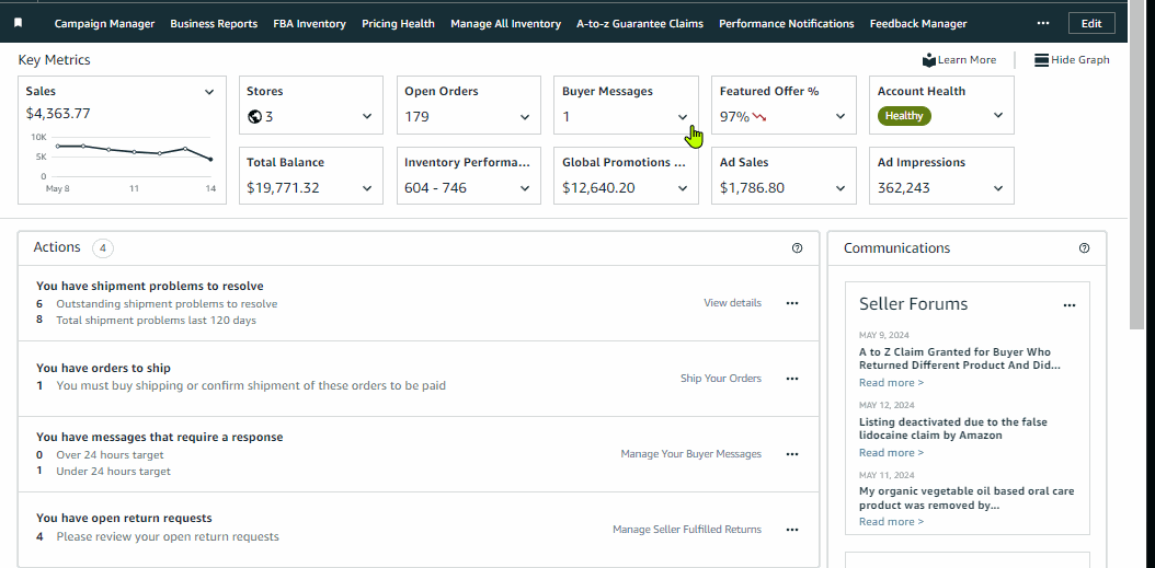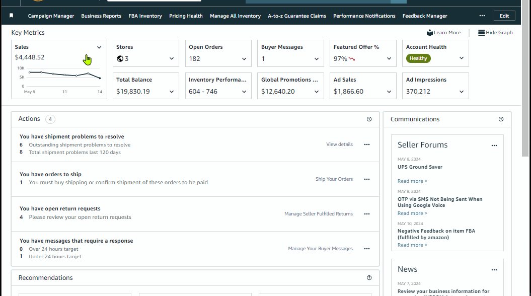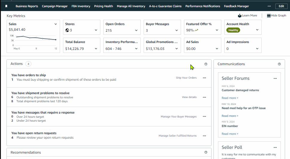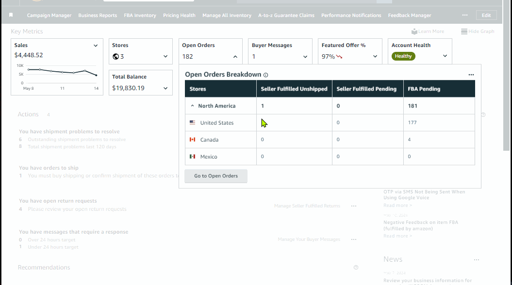 Prioritize these key outstanding or upcoming actions to ensure your business is in good health which includes but not limited to outstanding pending orders to ship, shipment issues, listing issues and risk of deactivation.