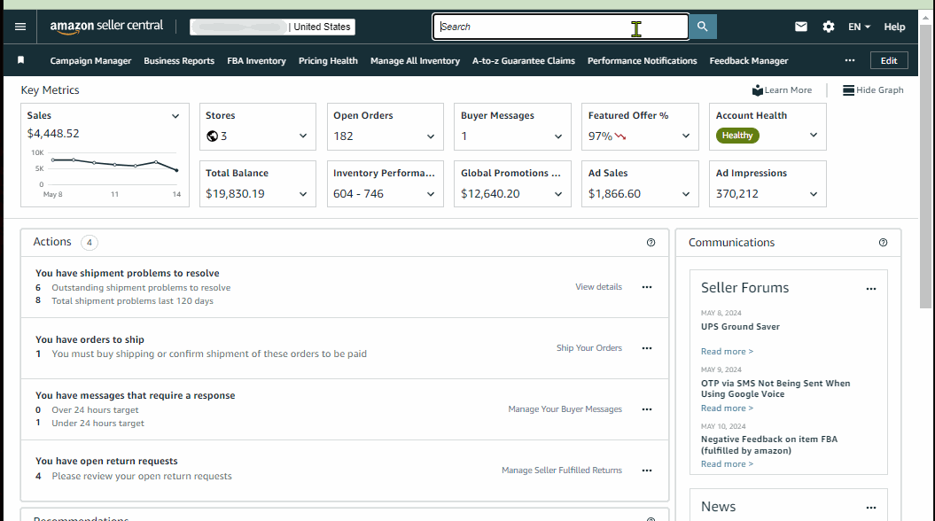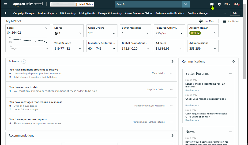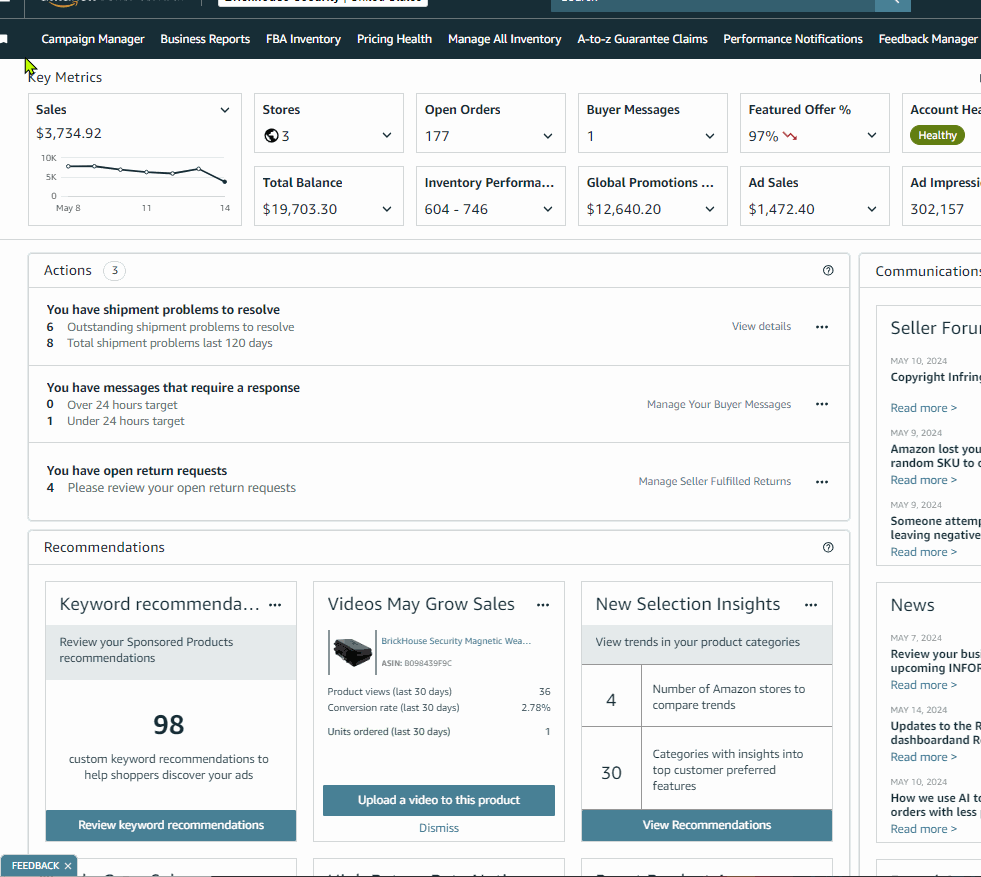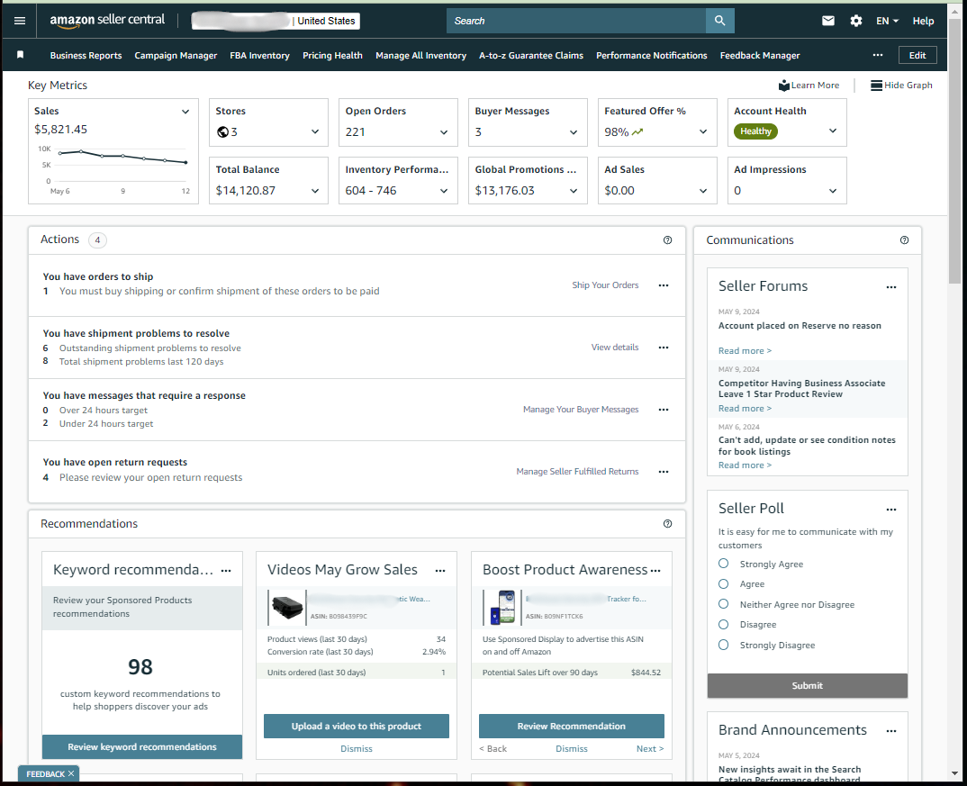 Prioritize these key outstanding or upcoming actions to ensure your business is in good health which includes but not limited to outstanding pending orders to ship, shipment issues, listing issues and risk of deactivation.