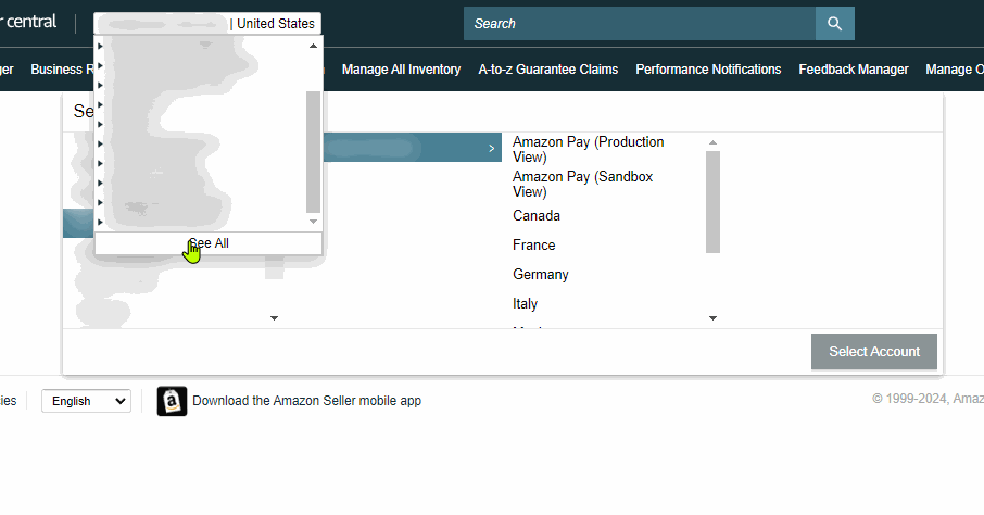 Dropdown to select managed account names, at times there are side arrows on left which spreads dropdown for Marketplace selection without the need of selecting the account first or going to the login account selection interface.