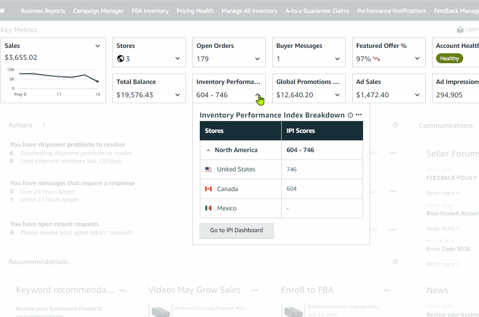 Quick view and quick link for each marketplace’s Inventory Performance Index Score