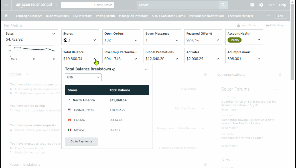 Quick view for each marketplace’s Account balance which also quick links to each Payment dashboards.