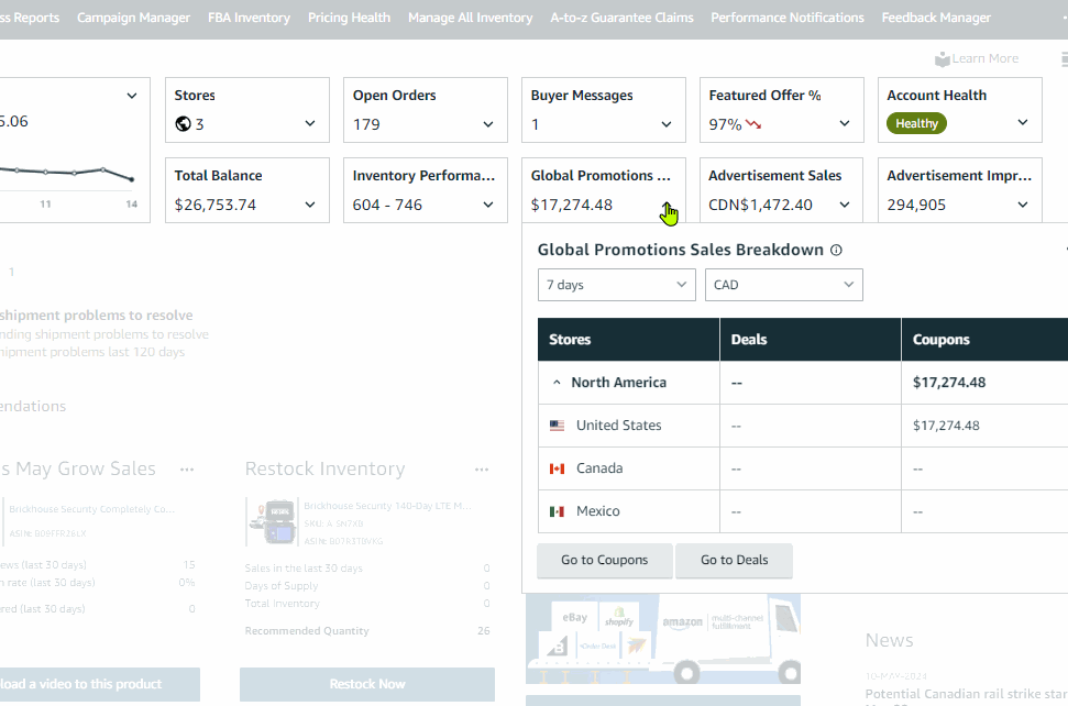 Quick view for each marketplace’s Global Promotions Sales indicator monitors marketplace-level sales generated from promotion tools of Coupons and Deals (Best deals and Lightning deals) for the selected time period in the breakdown, while 7 days is shown on the front card. Only links to Current Marketplace’s Coupons and Deals Dashboard.