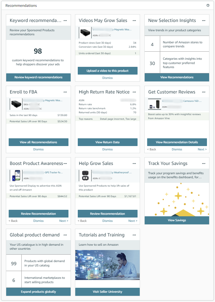 Additional widgets according to Amazon recommendations or suggested programs which contributes to account growth and health.