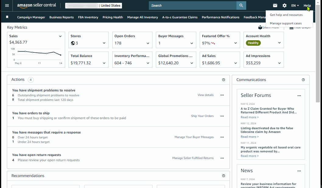 The infamous Help button to either proceed to Seller Support Help Tool or lobby link to manage existing cases.