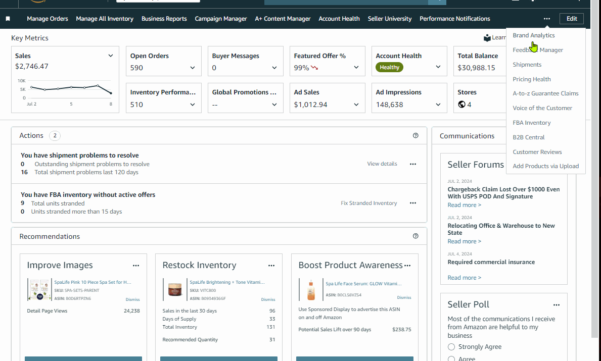 Advertising - Links to Campaign Manager (Ideally open this with new tab as it loads to campaign console), A+ Content Manager, Creator connections, coupons, deals and promotions consoles.
