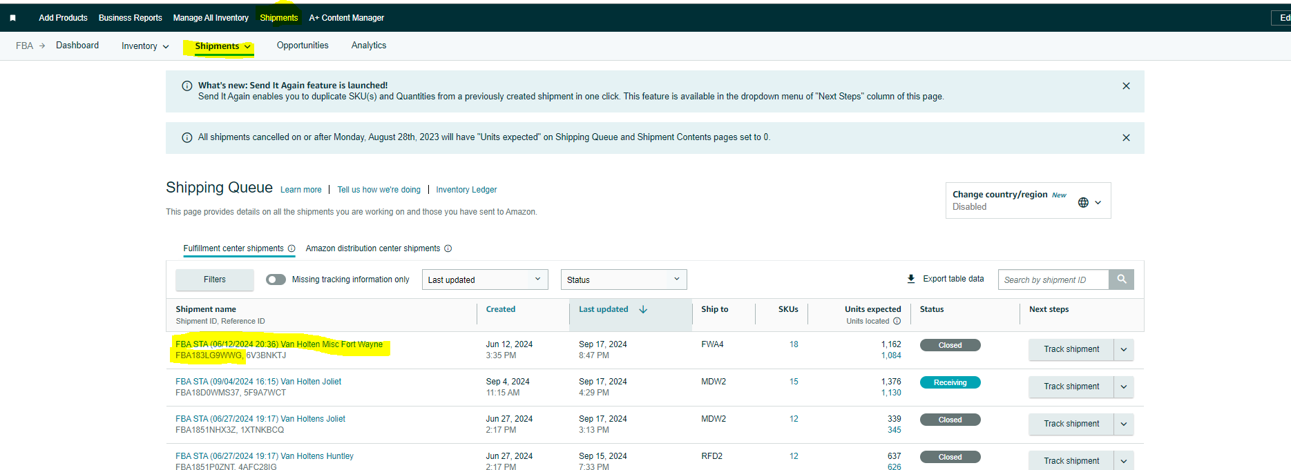 Step 2: Navigate to the corresponding Amazon Seller Central account - shipments tab - and find the shipment with the same name as what was in Asana.