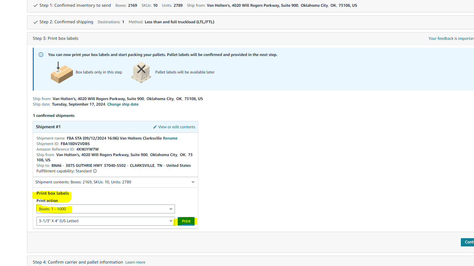 Step 6: Navigate to Amazon Seller Central - Shipments tab - find your shipment - Under Step 3 in the "Send to Amazon" process, click "Print" to print the box labels for the shipment. These labels have to be cut out separately and joined with each line item in the shipment manifest using the Amazon SKU.