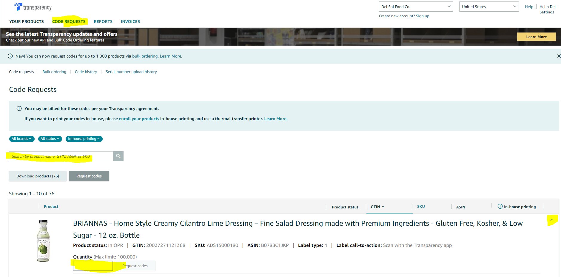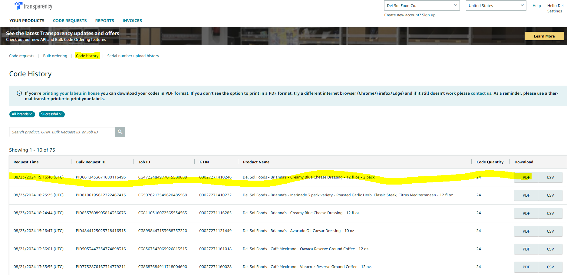 Step 7a: From there, it is time to print the "Item labels" for the shipment. Most shipments require transparency labels. This is the first thing we should look at when we are printing shipment item labels. Log into the Amazon transparency portal using your Amazon Brand Registry credentials. Navigate to the "Code Requests" tab and enter your sku into the search feature. If your sku appears, select the dropdown arrow on the right side and enter the quantity you want to request. Once you click "Request Codes", navigate to the "Code History" link at the top of the page and download your codes from there to be printed. Combine your transparency labels with the corresponding line item on the shipment manifest.