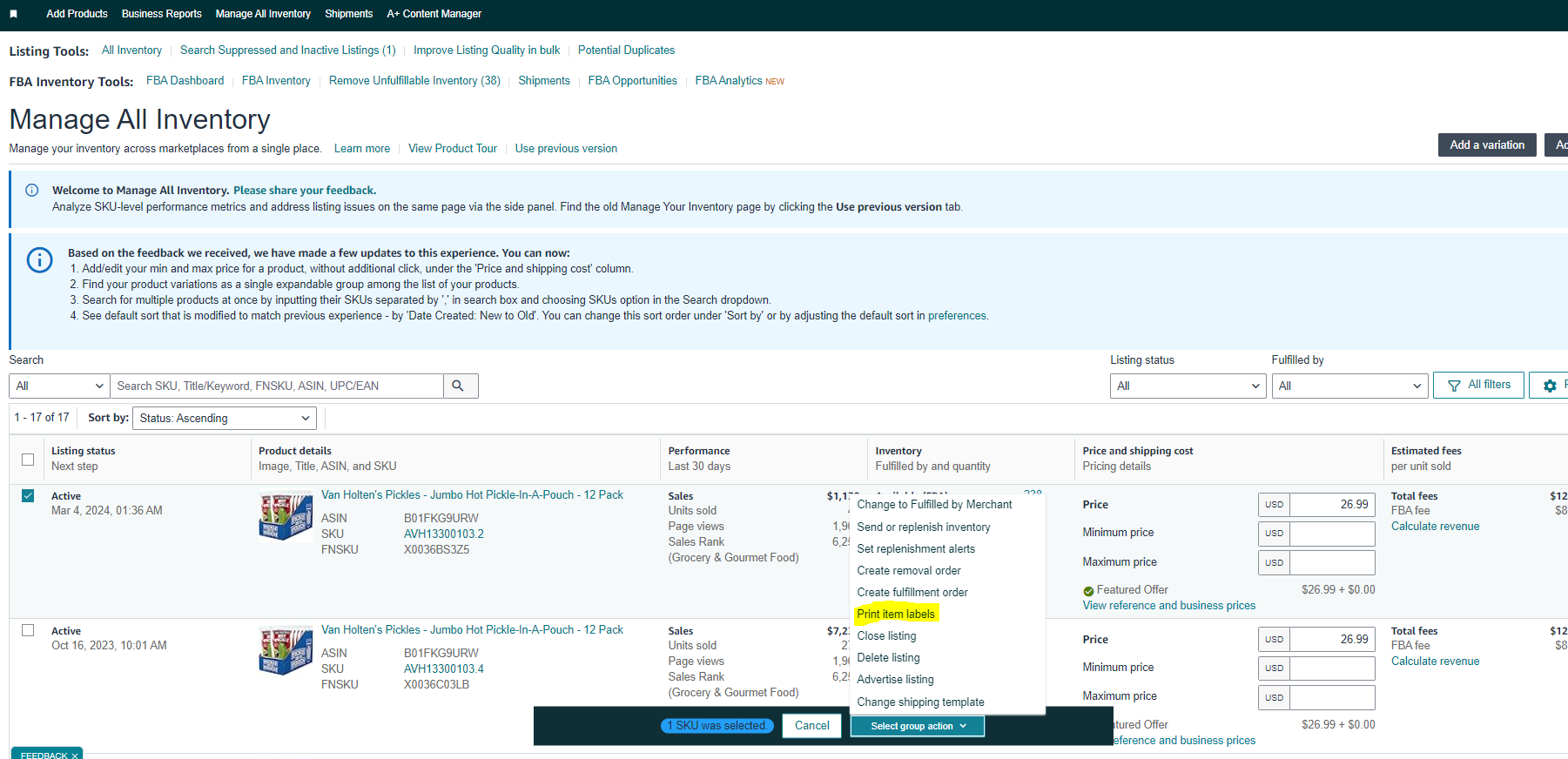 Step 7b: If your sku does not require transparency labels, navigate to "Manage All Inventory" in Seller Central and select the product you want to print item labels for. The menu will appear and you will select the " Print Item Labels" option. Enter your quantity and following the printing steps.