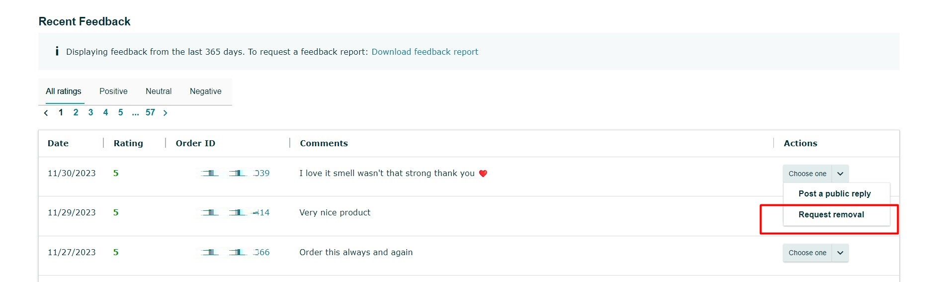 Scroll down to find the "Recent Feedback" section. For each feedback, you have two possible actions to take. You can either post a public reply or request removal.