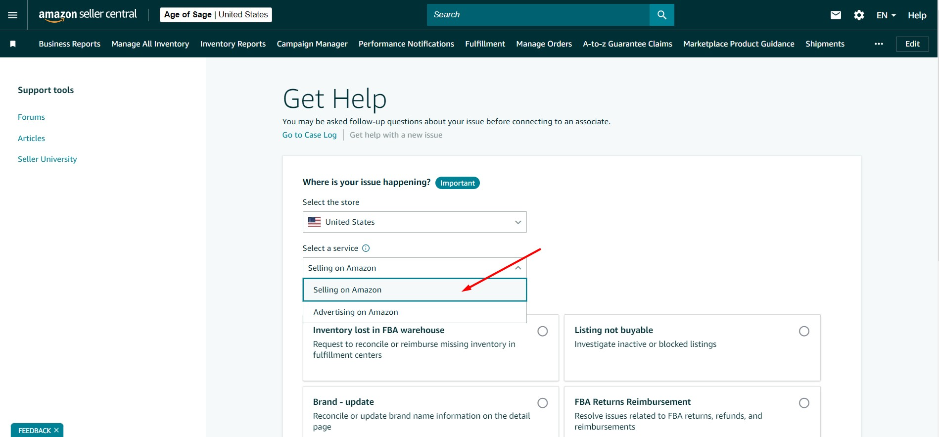 1. Log in to the seller central account (Make sure you are in the correct Account.)