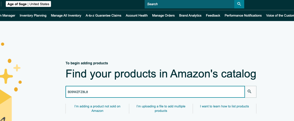 Paste the ASIN in Find your products in Amazon's catalog and press the search icon