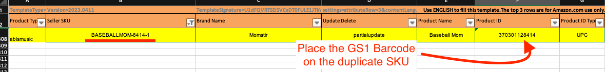 - Upload a partial update feed file with SKU, product id type, and product id (GS1 Barcode).
